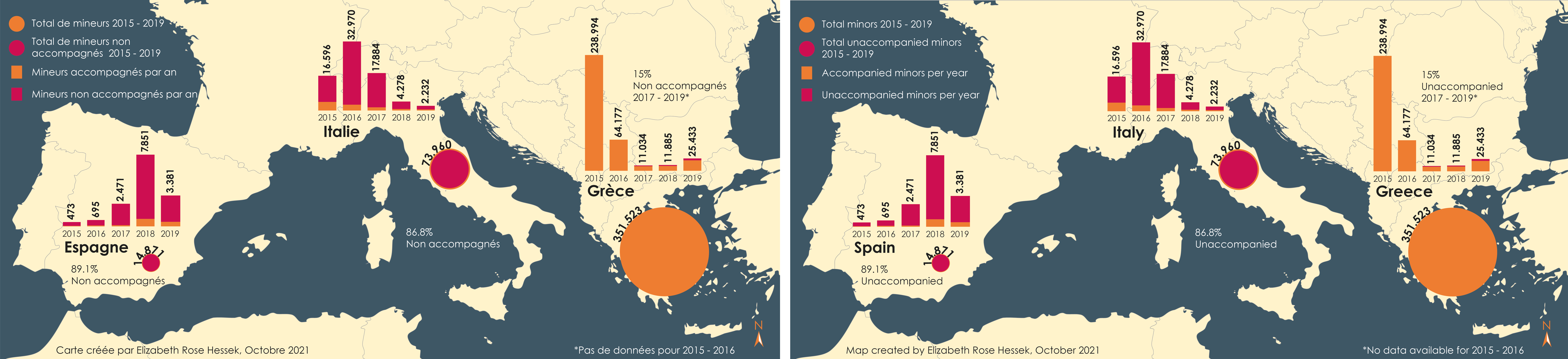 Figure 1: Unaccompanied minors arriving in Mediterranean Europe 2015-2019. Map created by Elizabeth Rose Hessek, October 2021. Sources: Vives and Williams (2021), Fiscalía General del Estado (2020)