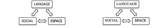 L’urbanisation est, de fait, autre chose que le seul accroissement quantitatif de la densité de l’habitat et de la diffusion d’une culture urbaine. Elle résulte des conflits et tensions » (Bulot, 2001, p. 308). Cette évolution fait écho selon moi à celle observée dans les travaux de Lefebvre, passant d’un « droit à la ville » (Lefebvre, 1968) à « la production de l’espace » (Lefebvre, 1974), et marquant l’évolution d’un processus prenant d’abord place dans le lieu spécifique de la ville à celui d’un processus global d’un « droit à l’espace ». Pour se référer à l’approche que je développe dans cet article, je propose donc de parler de sociolinguistique spatiale (plutôt que de sociolinguistique urbaine) et cela essentiellement pour deux raisons : faire explicitement écho à cette spécificité d’un processus global de la spatialité qui doit également se comprendre dans sa perspective socio-langagière ; gagner en intelligibilité quant à cette approche et à ce qu’elle problématise (ce qui induit également et modestement de la rendre accessible et mobilisable pour un plus grand nombre de personnes travaillant sur des problématiques liées à l’espace et non uniquement à la ville).